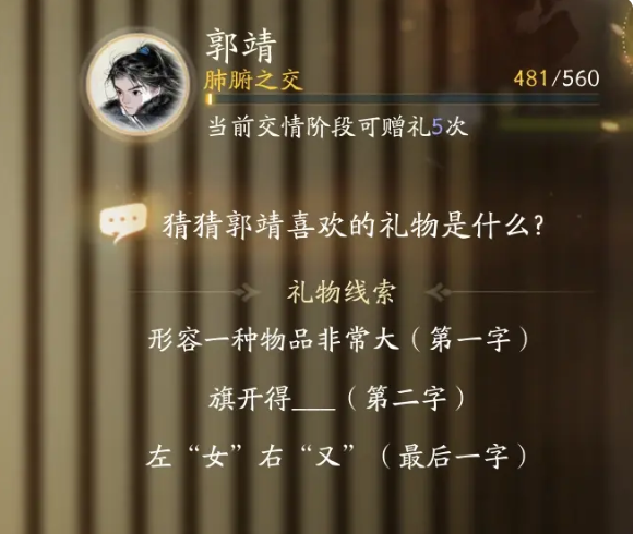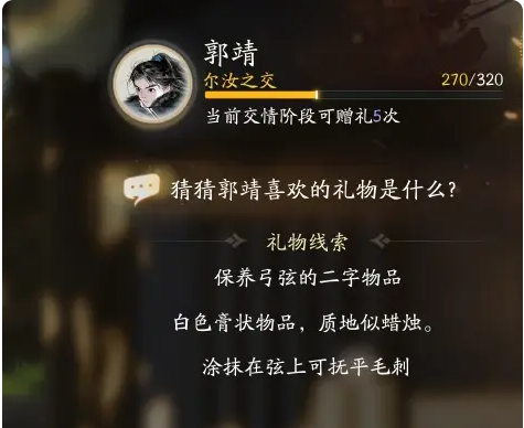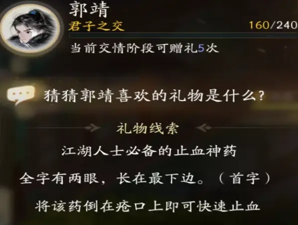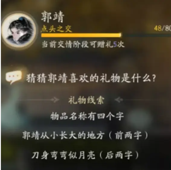 以上就是小编整理带来的射雕郭靖喜欢的礼物是什么,郭靖喜欢礼物线索大全分享,更多精彩内容,请点击关注手游网更新!