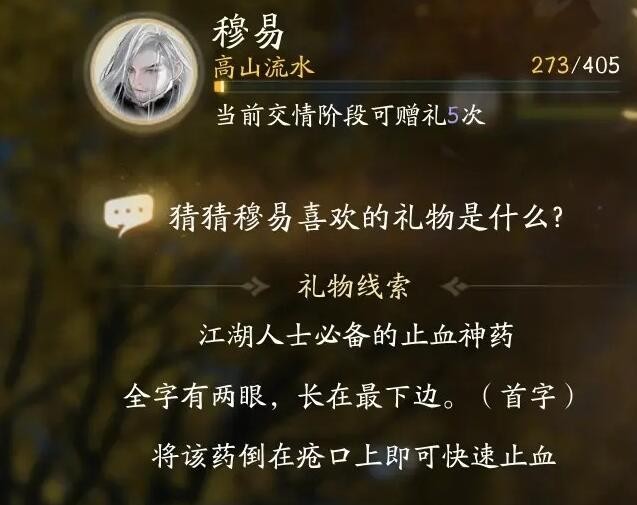4、礼物线索:江湖人士必备的止血神药;全字有两眼,长在最下边(首字),将该药倒在疮口上即可快速止血。