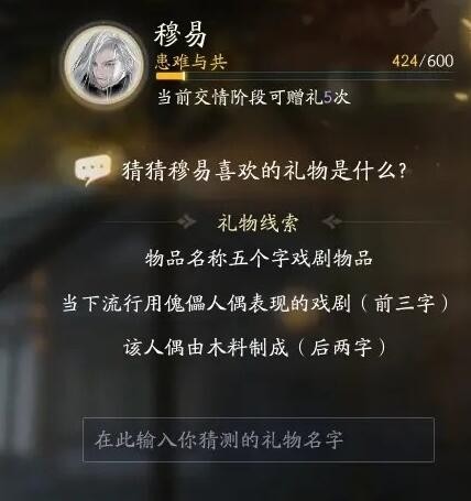 5、礼物线索:物品名称五个字戏剧物品;当下流行用傀儡人偶表现的戏剧(前三字),该人偶由木料制成(后两字)。