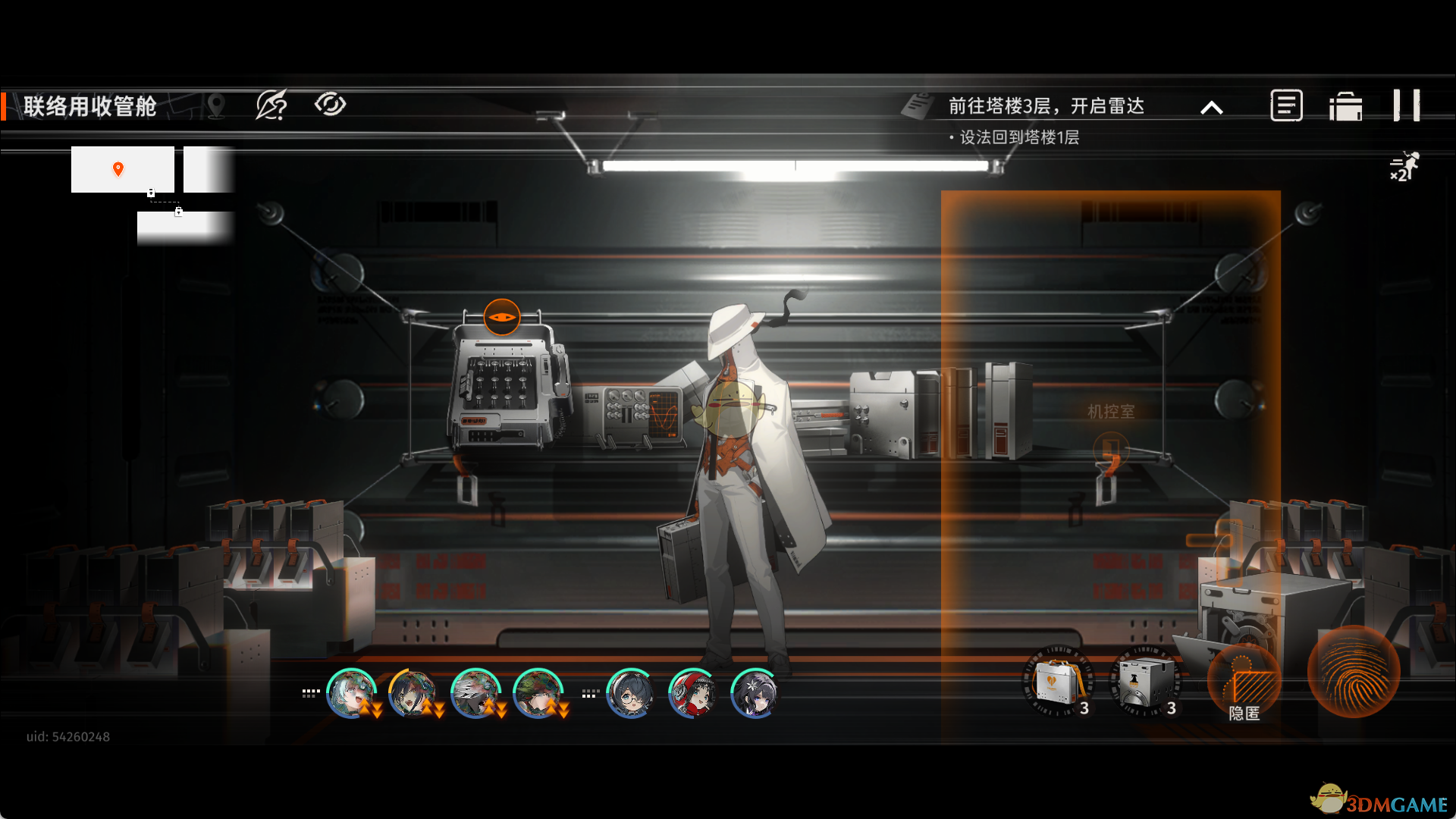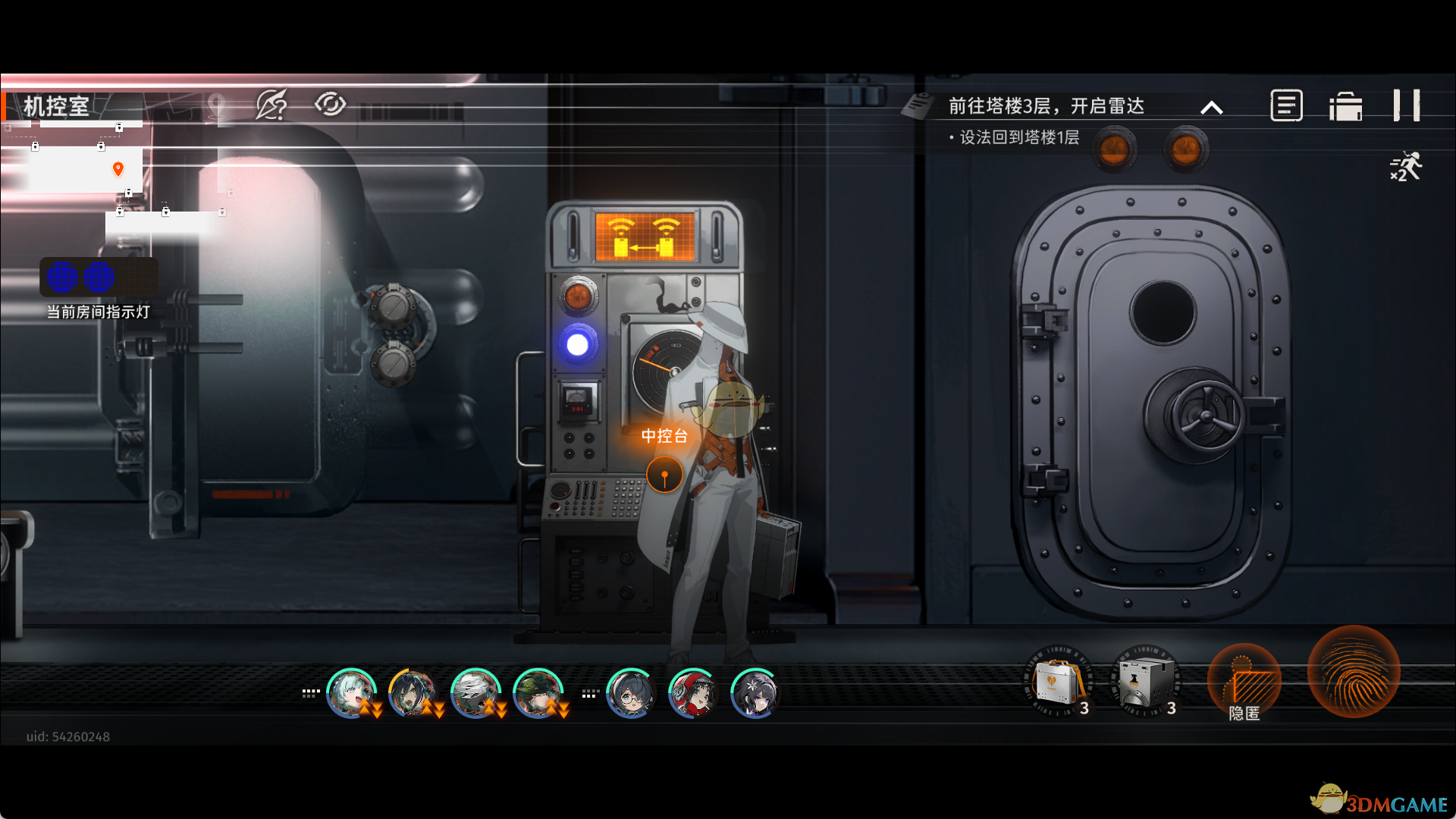 5、离开房间往右走,点击和中控台交互,进入机控区域,触发剧情后往右走,调整中控台把工具舱门打开。