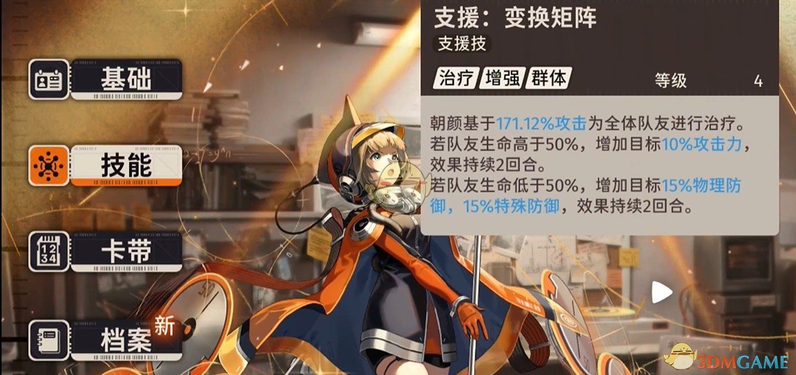 全体回血,以及增加攻击力,如果血量低,就是加双防,因为现在的自动逻辑,朝颜的自动战斗并不好用,更适合放在支援位。