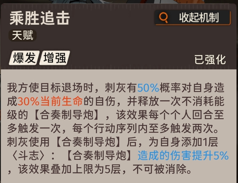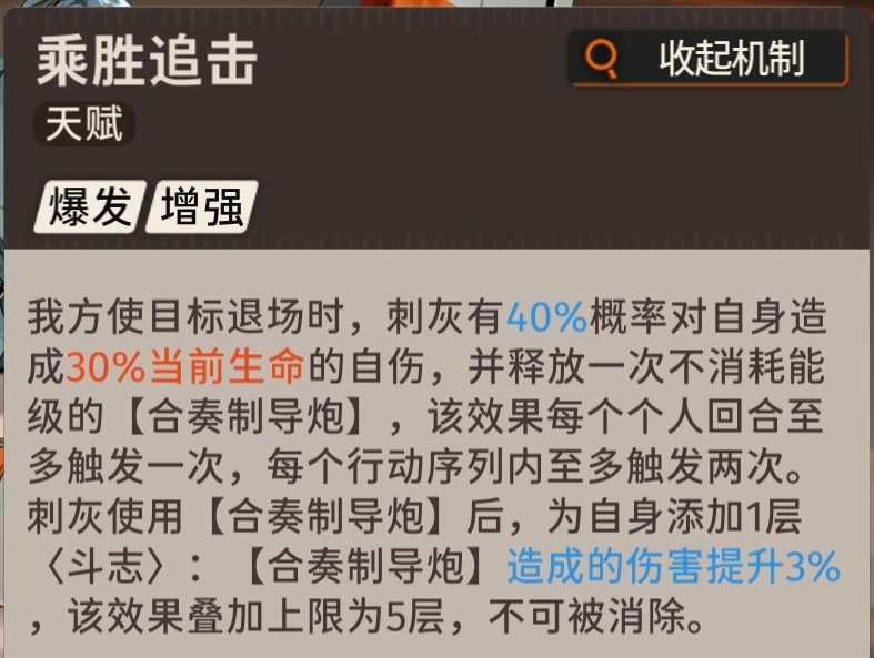 刺灰非常依赖于被动『乘胜追击』打输出,所以大招倍率显得不会太高,甚至只有约净天大招的一半倍率。