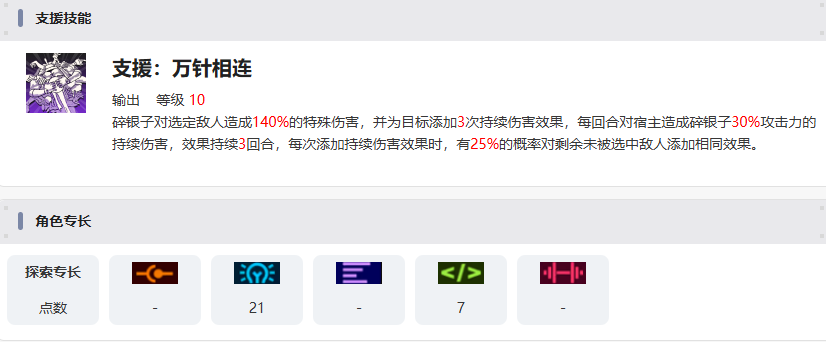 碎银子对选定敌人造成265%的特殊伤害,并为目标添加3次持续伤害效果,每回合对宿主造成碎银子30%攻击力的持续伤害,效果持续3回合。使用本技能对敌人添加持续伤害效果时,碎银子有25%概率将目标身上全部持续伤害效果的持续时间重置为对应最大持续回合数