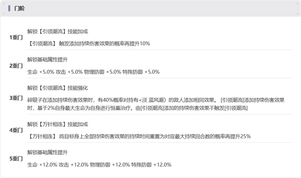 结合最佳四星半专拐绿雪,可以无缝释放技能2,提供30%的攻击力、30%的暴击率和90%的效果命中。经过高级认证后,开局能自动释放技能2,增强群体输出能力。