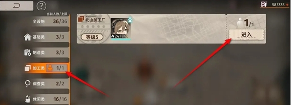 2、在设施页面点击左侧的加工栏,之后点击进入详情页。