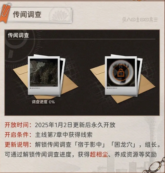 开启条件:主线第7章中获得线索更新说明:解锁传闻调查「宿于影中」「困龙穴」,组长。可通过解锁传闻调查进度,获得超相尘、养成资源等奖励
