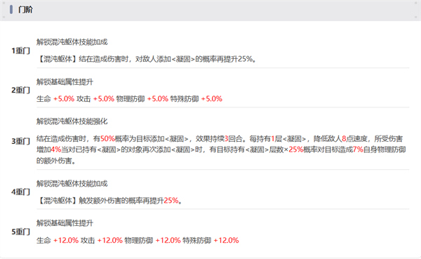 结的前期作用并不明显,主要通过给对手增加易伤和减速(拉回合条)来间接提升全队的输出保障。虽然其基础数值面板相比其他六星角色略显不足,但结的技能和大招能有效挂上易伤状态,且这一状态可以持续六回合(3+3),为技能的回能提供了良好条件。结的技能等级越高,命中概率也会提升,能够更频繁地为敌方施加易伤。