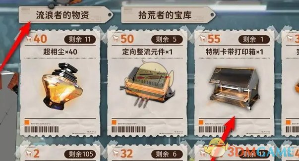 2、在这个页面,点击左侧流浪者的物资,选择特制卡带打印箱进行购买;