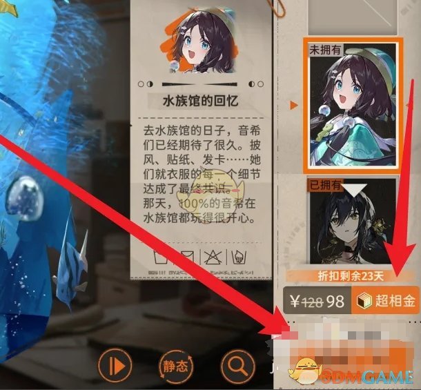 答:在装束橱窗找到水族馆的回忆皮肤,花费超相金即可购买获取皮肤。