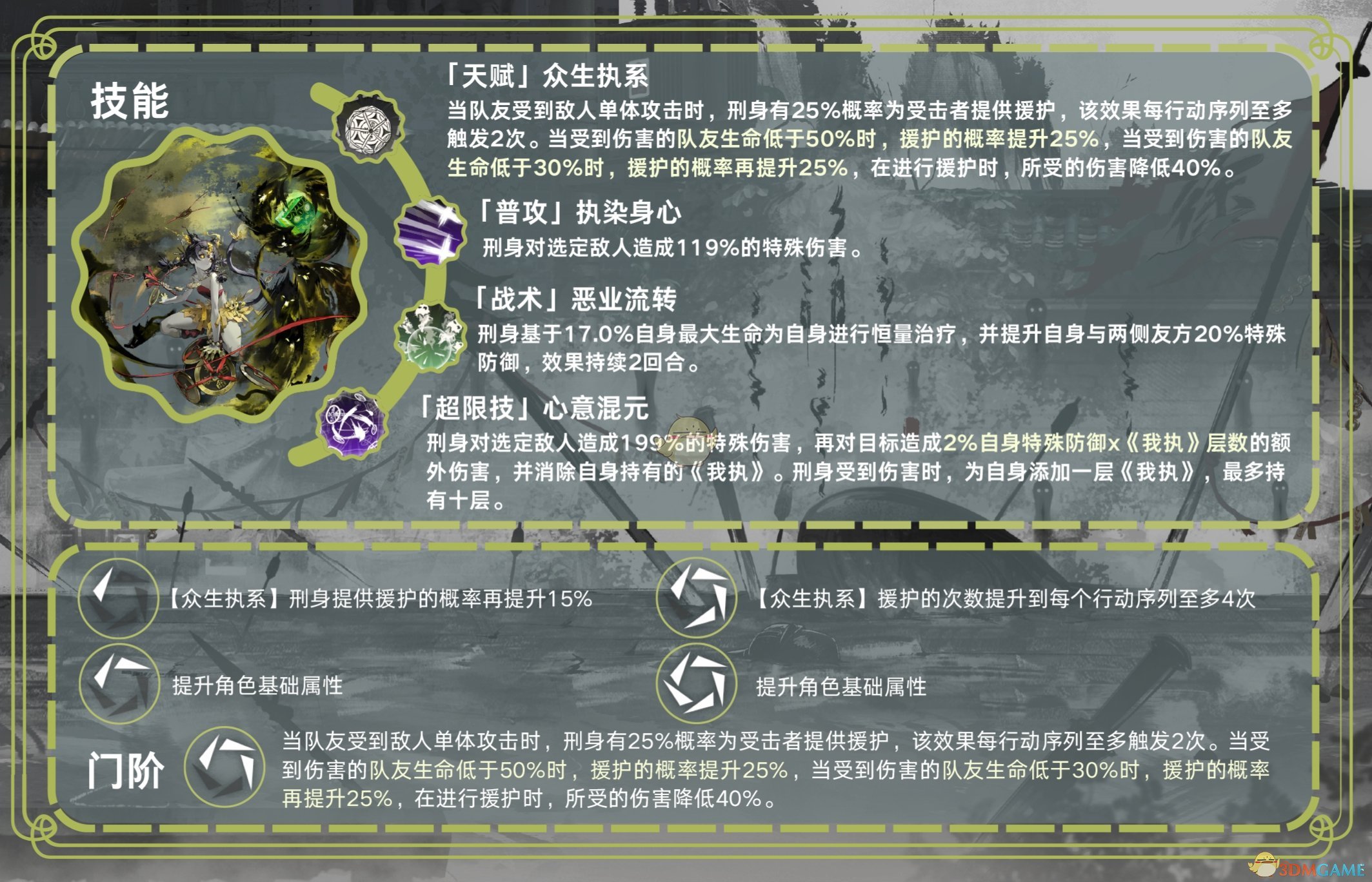 其中1.3阶是提高援护队友的概率,而4阶是增加每回合可以援护队友的次数,再加上刑身是五星角色,4阶的话难度不大。