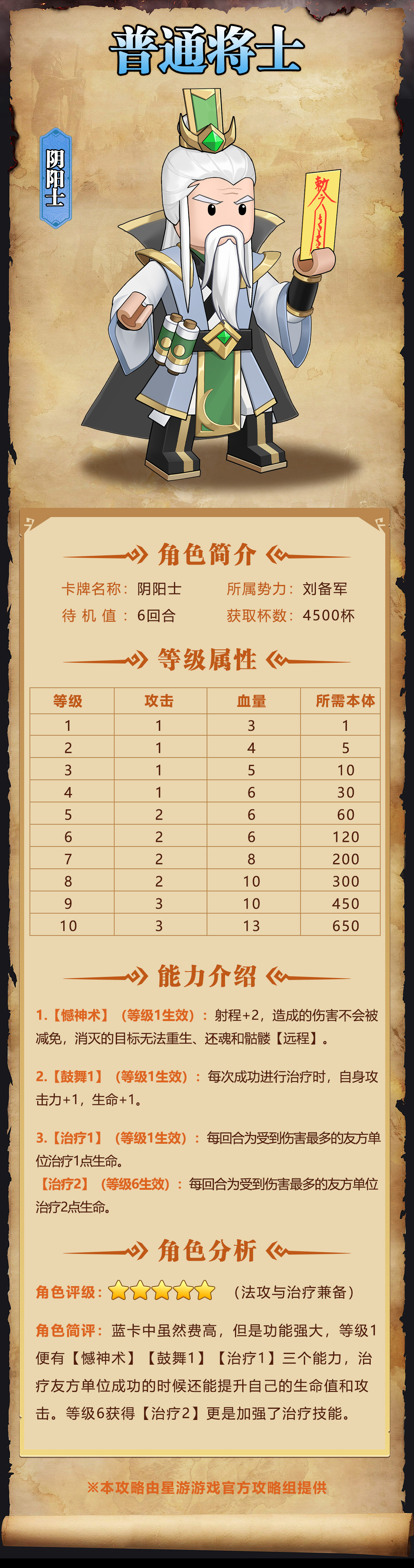 我是小奇兵游戏中按照势力不同多个阵营,其中刘备军中卡牌阴阳士怎么样呢?这是一位普通将士,是蓝卡中虽然费高,但是功能强大的卡牌!今天小编就给大家带来了《我是小奇兵》阴阳士角色图鉴分享,包含该卡牌角色的属性、技能等信息,想要了解详情的可以来看看哦!