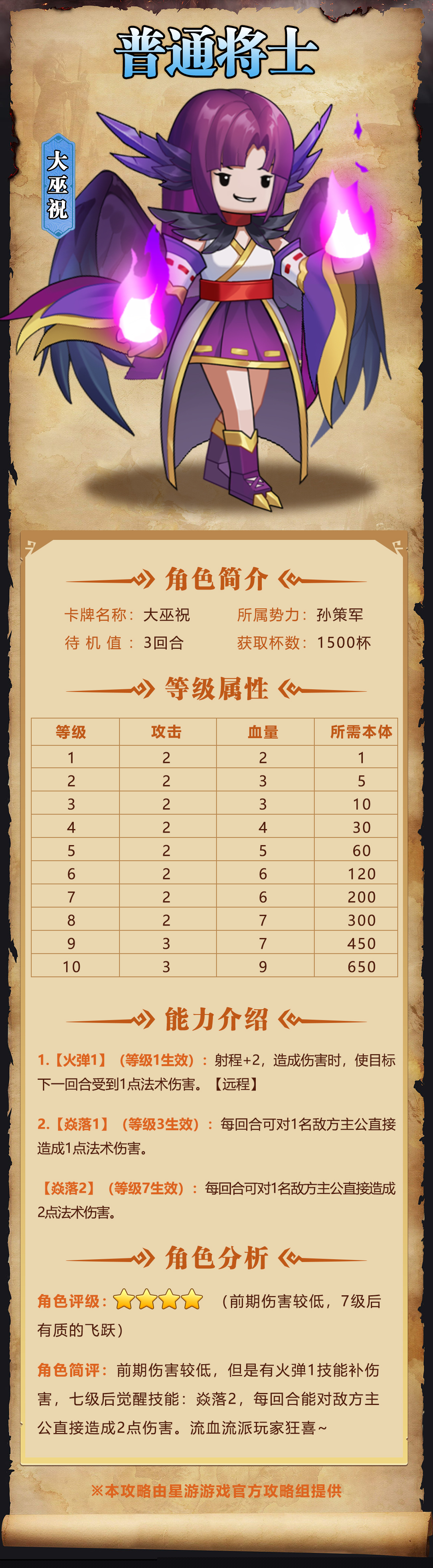 我是小奇兵游戏中按照势力不同多个阵营,其中孙策军中卡牌大巫祝怎么样呢?这是一张四星普通将士,前期伤害较低, 7级后有质的飞跃!今天小编就给大家带来了《我是小奇兵》大巫祝角色图鉴分享,包含该卡牌角色的属性、技能等信息,想要了解详情的可以来看看哦!