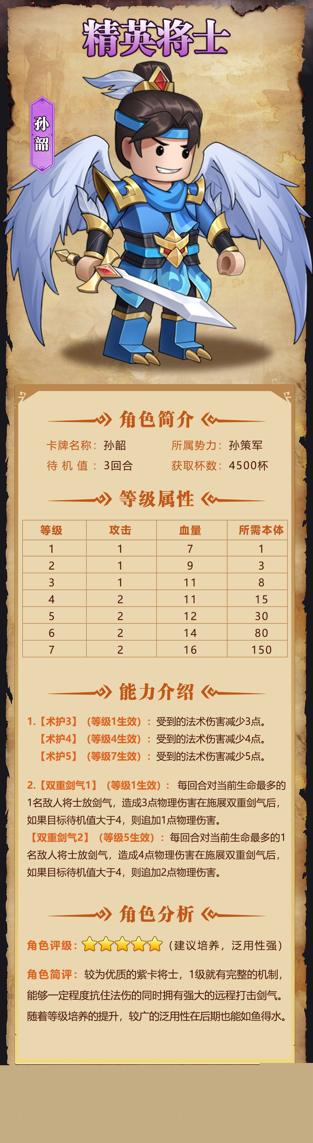 角色简评:较为优质的紫卡将士,1级就有完整的机制,能够一 定程度抗住法伤的同时拥有强大的远程打击剑气。随着等级培养的提升,较广的泛用性在后期也能如鱼得水。