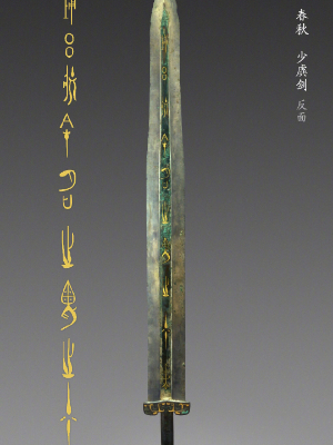 少虡剑是春秋晋国兵器。剑身较长,出刃锋利,出土时几乎没有锈蚀痕迹,剑锋略有残断,整体光亮如新。剑格处有嵌绿松石的兽面纹,剑首有错金云纹。剑脊处有20字铭文,铭文中提到的少虡二字是此剑的名称来源。虡,是一种龙身鹿首的神兽,剑主人应是希望自己像初生的虡一样,能够无所畏惧、勇猛向前。现藏于北京故宫博物院。