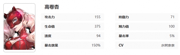 《女神异闻录:夜幕魅影》高卷杏怎么样?高卷杏是女神异闻录中的5星角色,初始人格面具是「卡门」,那么高卷杏在夜幕魅影中有着什么样的技能,意识又有哪些加成呢?接下来就让我们一起了解一下吧。