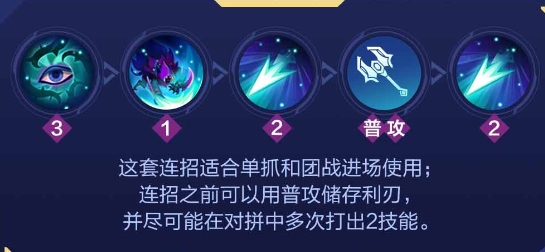 后期没有大招时多控制野怪资源或带线,打团前开启大招分割敌方视野,利用草丛隐藏视野突进敌方脆皮英雄,奠定团战的胜利。