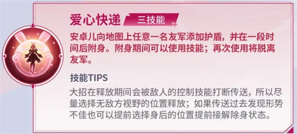 安卓儿可以有效的保护已方自保能力较差的输出英雄,配合己方关键输出英雄可以打出1+1>2的效果,在配合一些持续作战能力强的战士类英雄,也可以使其愈战愈勇。