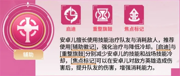 安卓儿擅长使用技能治疗队友与消耗敌人,推荐使用[辅助微记],强化治疗与降低冷冷却。[启迪]与[重整旗鼓]分别减少安卓儿的技能和战场技能冷却,[焦点标记]可以在安卓儿对敌方英雄造成伤害后,提升队友的伤害,增强消耗能力。