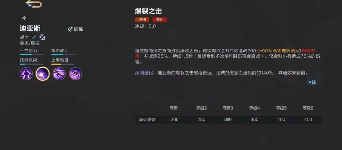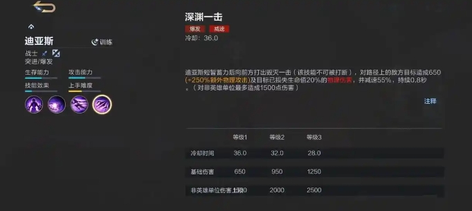 最致命的技能莫过于深渊一击,在使用该技能前,迪亚斯需要先进行短暂的蓄力,然后向正前方发动一次毁灭性的攻击,对前方的敌人造成巨额的物理伤害。还附带减速效果,即便不是致命一击,也能有效降低敌人的移动速度,并且能够为队友创造更好的输出环境。