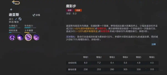 魔影步是迪亚斯的位移技能,允许迪亚斯向指定方向进行快速突进,并对目标造成物理伤害。如果迪亚斯在短时间内再次使用此技能,将对目标发动一次强力打击,进一步造成物理伤害并减少目标的物理防御力50%。在深渊强化下,这次强力打击的伤害会更高,减速效果将增强至75%,同时物理防御力减少效果降至25%。