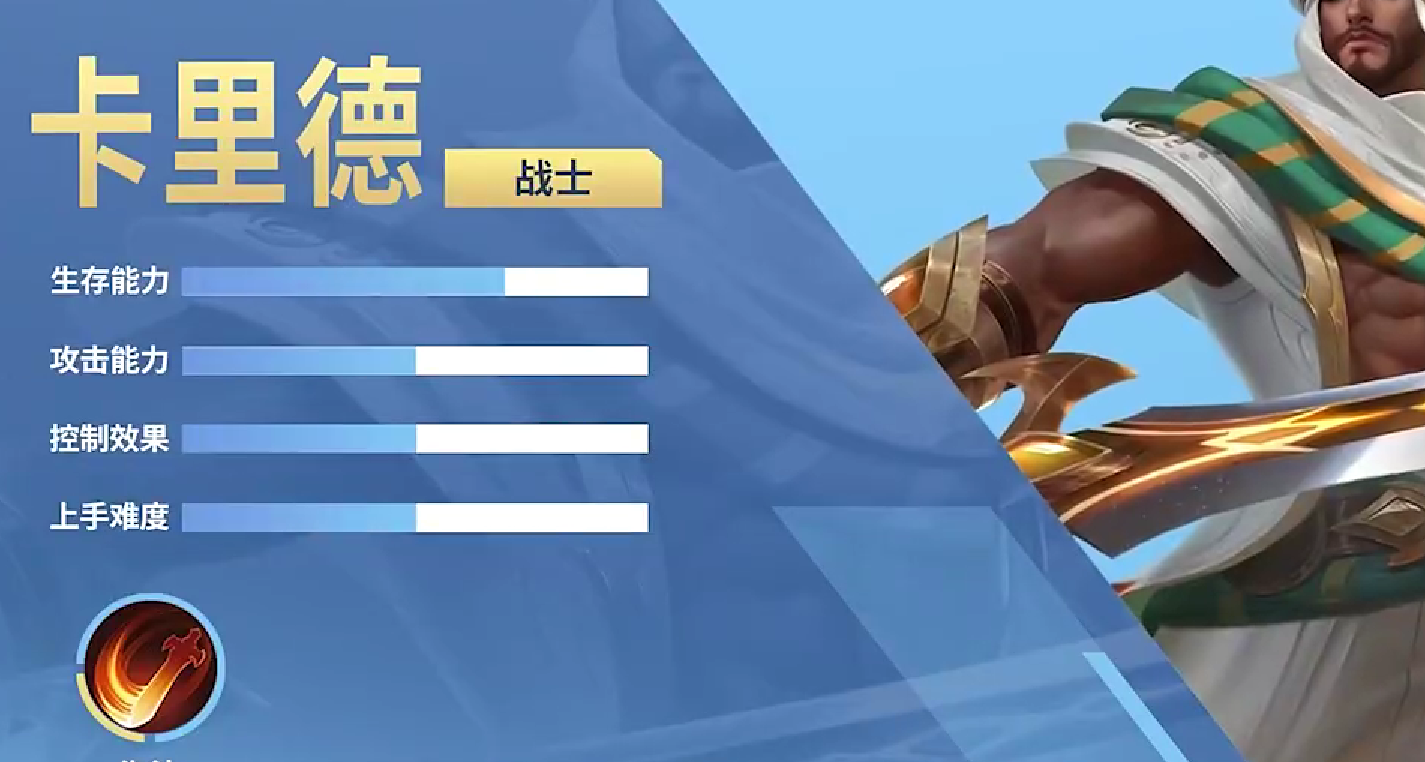 卡里德在游戏内定位是战士,作为狂沙勇士,他有极强的战斗攻击性,并且还具备有一定的防御能力。