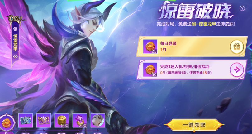 本次五一将会开启活动惊雷破晓。玩家们参与这个活动的话则是可以免费的领取翎的全新史诗皮肤惊雷龙甲。这个活动里面有不少的任务,玩家们只要完成任务便可以获取到奖励。在活动结束之后此皮肤将会正式上架商城。