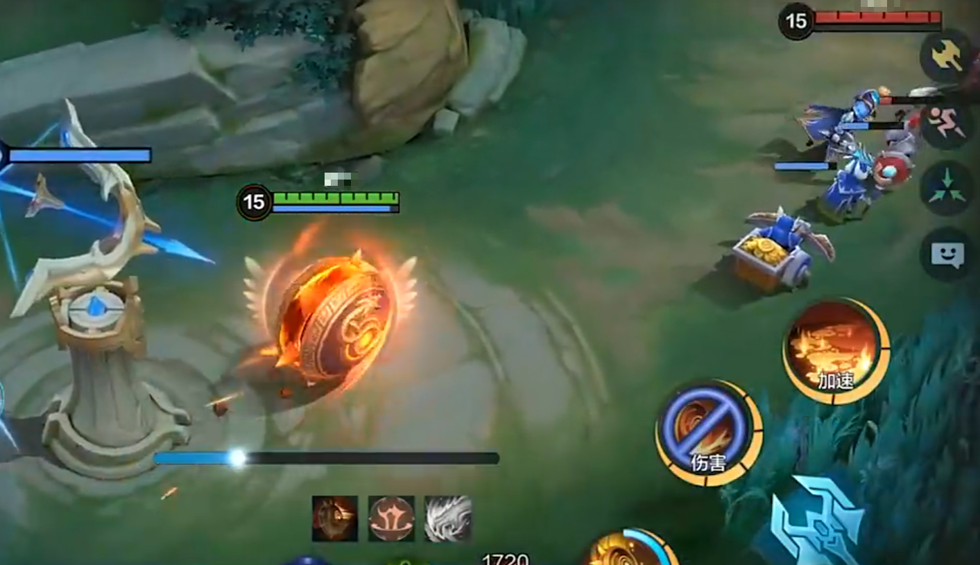 1技能释放,他会缩在护盾当中,加速进行翻滚,翻滚中再次使用1技能,可越过阻挡物或者敌方小兵,在跃起的过程中,如果身下有敌方英雄,会立刻砸向并眩晕该目标,同时也会对周围造成伤害和击退效果,可理解为强力位移技能,且附带控制效果。