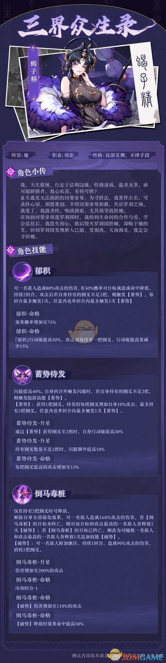 西游:笔绘西行是一款以西游为主题的手游,在游戏中大家可以见到许多熟悉的角色,每个角色都有独特的技能,其中蝎子精相信大家一定不陌生,那么在游戏中蝎子精怎么样呢?下面小编为大家带来了西游笔绘西行蝎子精角色介绍,感兴趣的小伙伴快来一起看看吧。