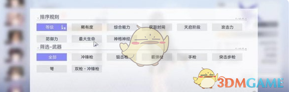 玩家可以更改排序设置,并通过筛选不同武器来迅速查看自己所拥有的角色。
