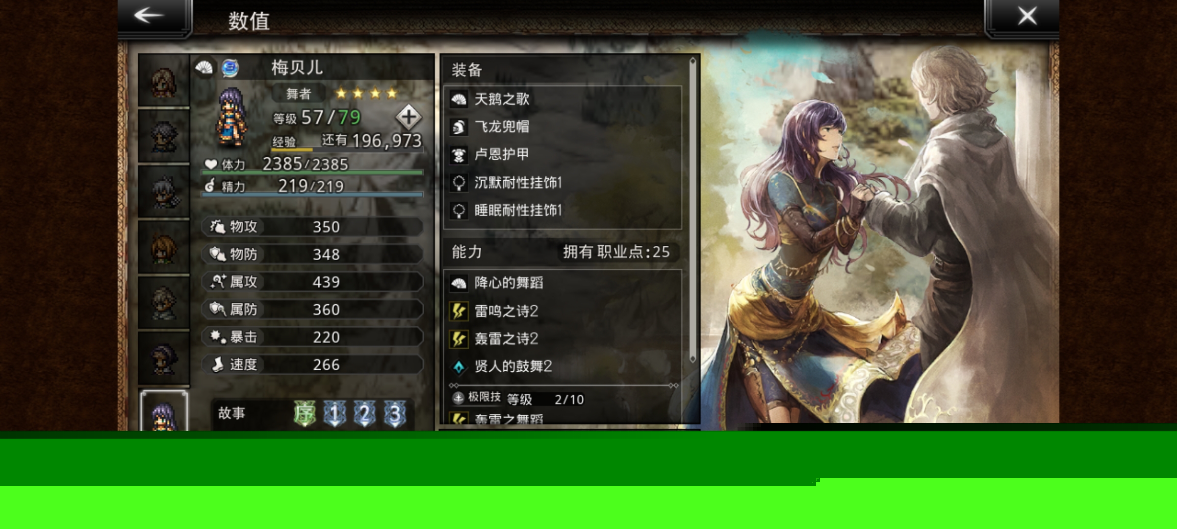 梅贝尔:+15属攻防,-10群属防,增益延长减益缩短五星舞女下位