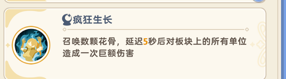 至于这个常规技能疯狂生长,在对应板块延迟5秒后造成伤害,躲开即可。注意哦困意高的时候这个是会秒人的,记得躲开哟!