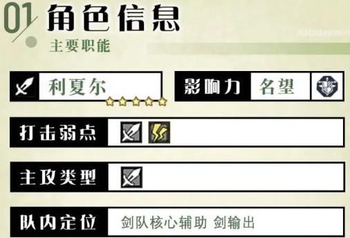 根据此游戏的buff计算方法,利夏尔可谓全身是宝。可为前排全体成员被动主动区的物攻&剑枪伤害加成,必杀剑枪伤害,主动剑耐性,能让剑枪2种弱点的输出手打出的伤害原地飞升。
