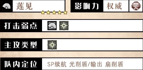 作为光输出使用。经国服上修后有了3BP时的4段随机扇技能,扇弱点方面的削盾能力也得到了一定的提升。