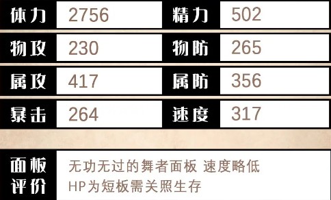 主打为我方加双防回SP的偏防守型的舞者。除此之外,有着光属性三连技能,因该属性的输出手本就稀缺,能够靠着合格的属攻与倍率