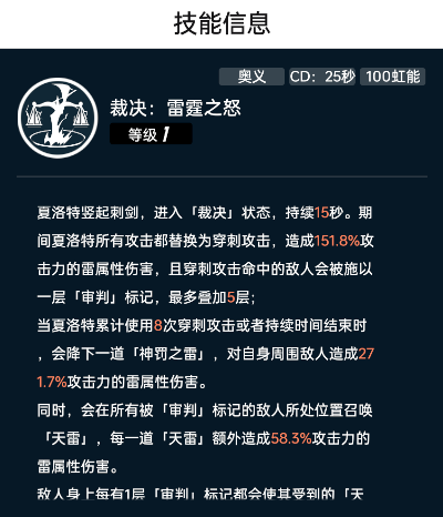 手法:蕾妮出场使用特技【冻结处刑,CD:8s】为场上范围敌人挂冰,切换夏洛特上场使用特技为自己添加雷附魔,然后站场打普攻和重击,利用雷克制冰,提高雷属性100%伤害,然后留意定身时间结束可以切雪莉娅上场使用特技【魔法牌绝对壁垒,CD:10s】击退范围敌人。用以上手法循环战斗即可,注意夏洛特奥义【裁决:雷霆之怒,CD:25s,100虹能】充能好之后随时切换上场使用!