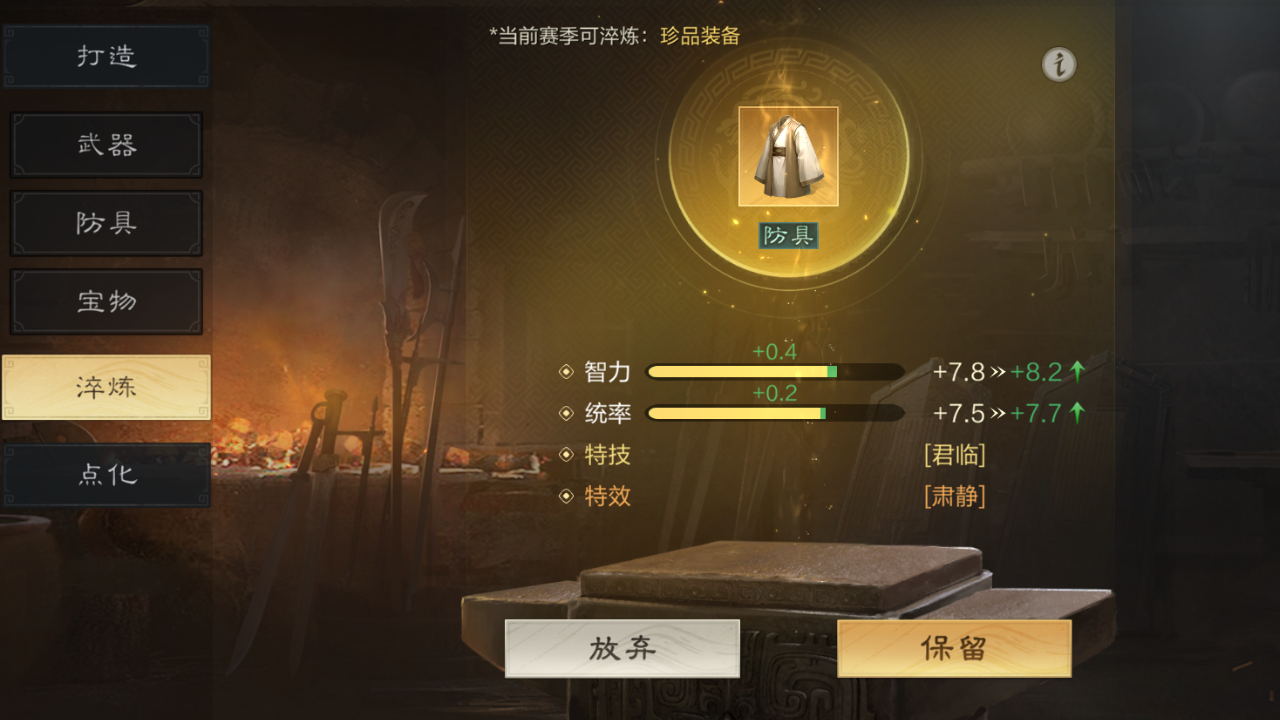 1、当霸业进行到“兵临城下”阶段时,铁匠铺会开放新功能“淬炼”和“点化”。