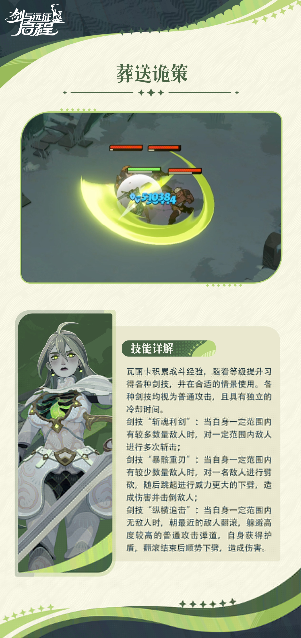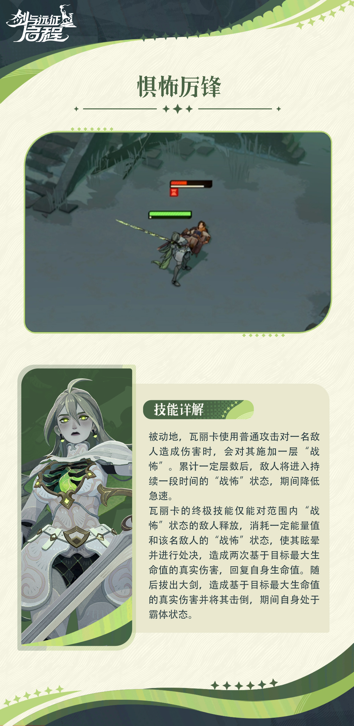 瓦丽卡,生前是白山公国坚毅的骑士统领,拥有无与伦比的剑术与令人肃然起敬的骑士精神。为了对抗冰恶魔、守护祖国,她付出了生命的代价。然而,执念与未竟的使命让她重归凡尘。接下来就由小编给大家带来了详细的《剑与远征:启程》瓦丽卡技能介绍!