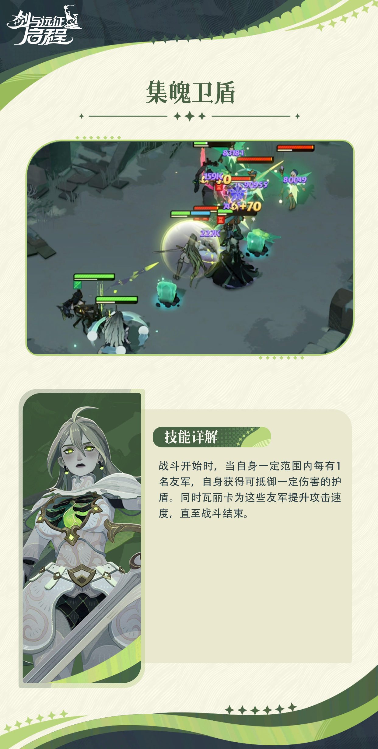 战斗开始:瓦丽卡范围有1名友军,就可以获得护盾,最大为自身90%的护盾,同时瓦丽卡给这些友军提升大量的攻击速度。