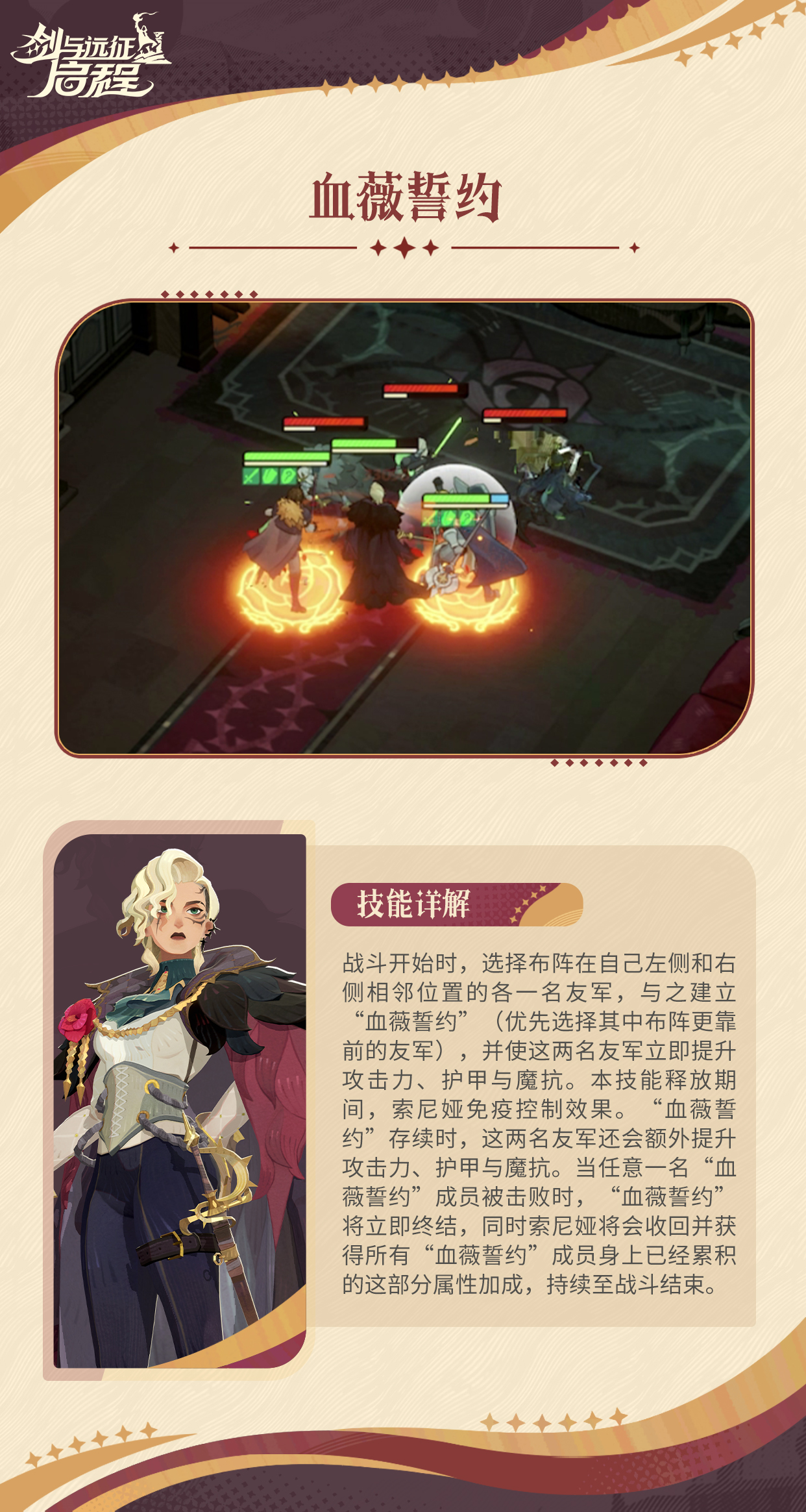 改变索妮娅一技能【血薇誓约】强化机制的核心专属技能,前面也说了被索妮娅一技能强化过的2名角色,其中任何一个角色在死亡后就会失去强化效果,并把这个强化攻击和防御的效果转移到索妮娅身上。