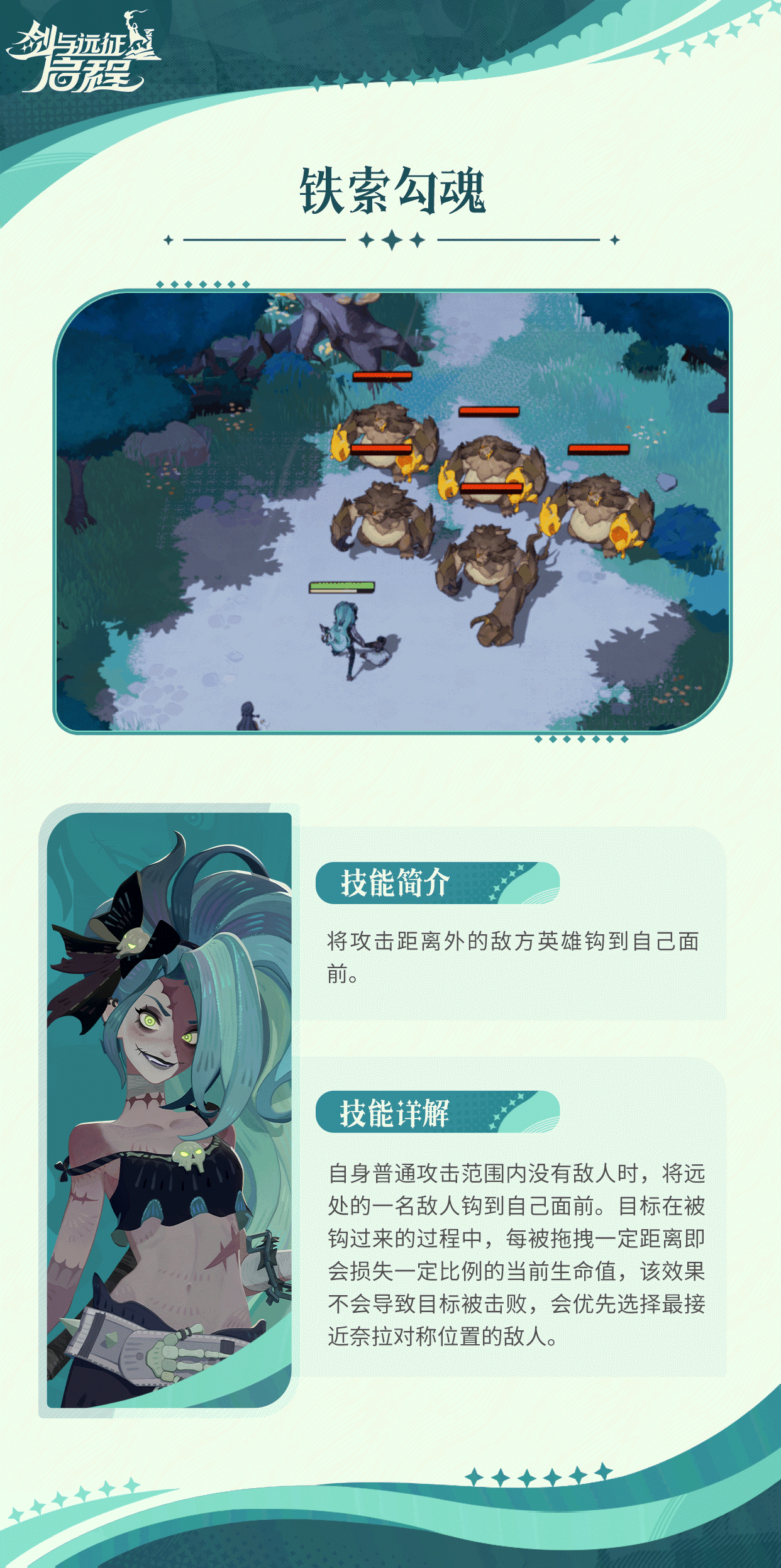 技能效果:奈拉投出铁索,将远处的敌人强行拉到自己面前。在这个过程中,敌人每被拖拽一段距离便会损失一定的生命值。比如在对战中,敌方后排的英雄容易被奈拉用此技能钩到身前,使其陷入危险境地。