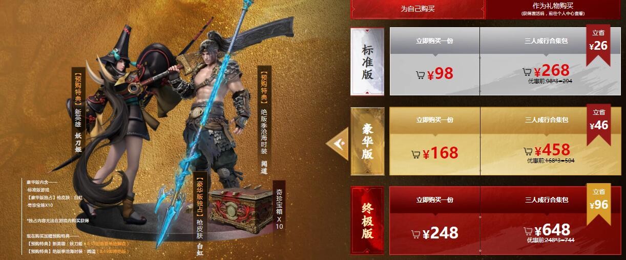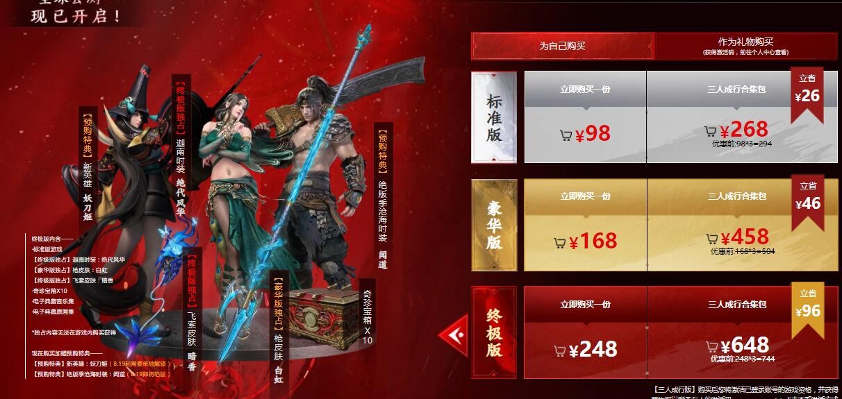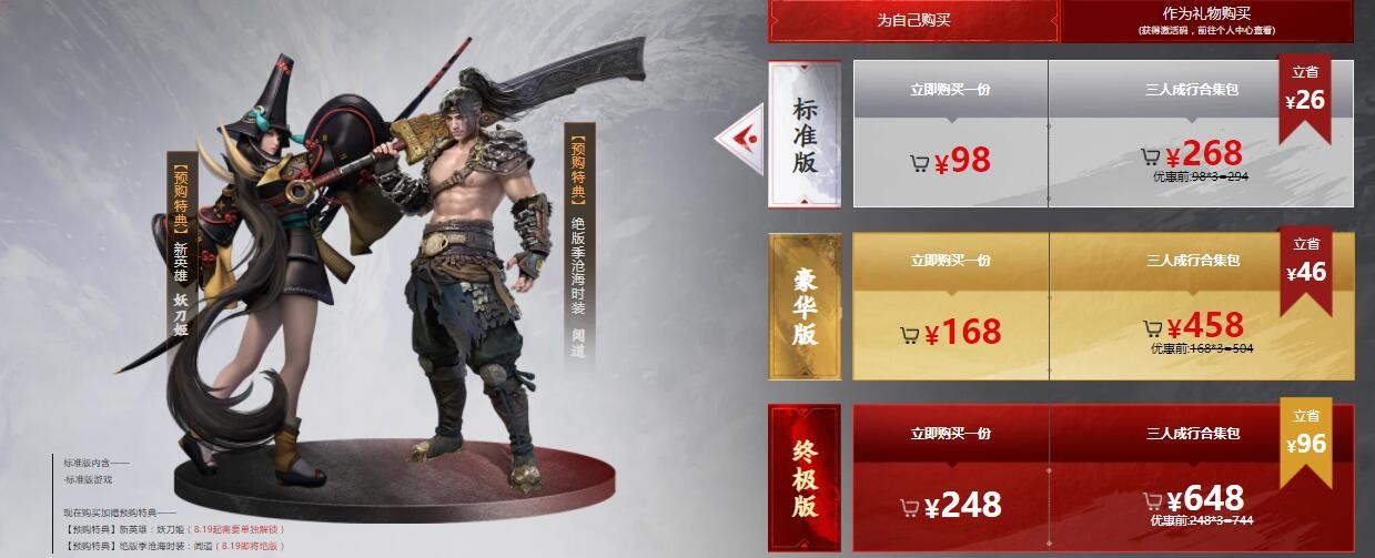 游戏购买分为三档,普通、豪华和终极版,价格如下: