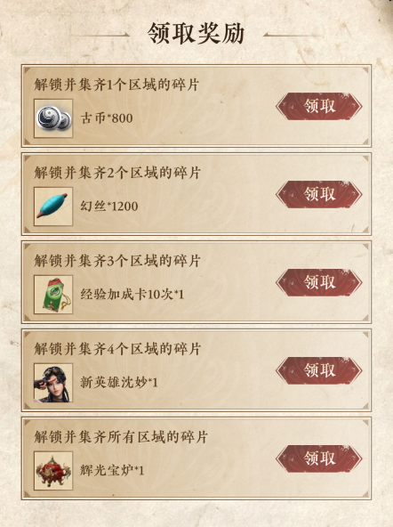 4.集齐一个区域的碎片就可领取区域奖励,想要获得新英雄沈妙需要解锁并集齐4个区域的碎片,集齐所有区域的碎片还可以得到辉光宝炉!