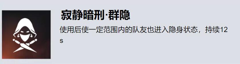 寂静暗刑·群隐:使用后使一定范围内的队友也进入隐身状态,持续12s。