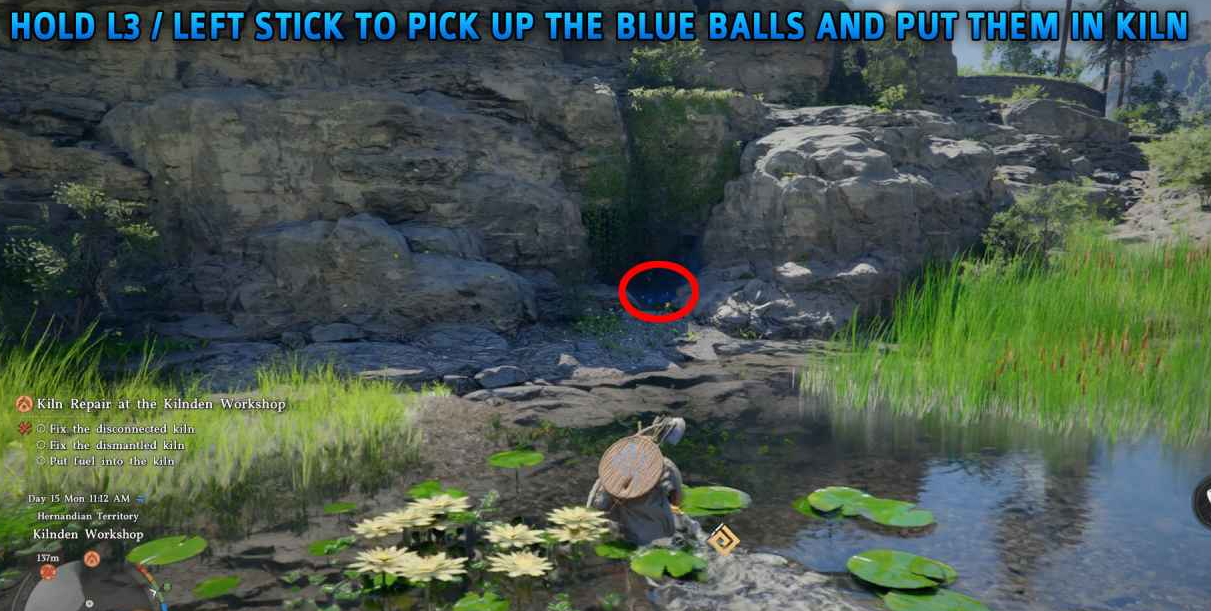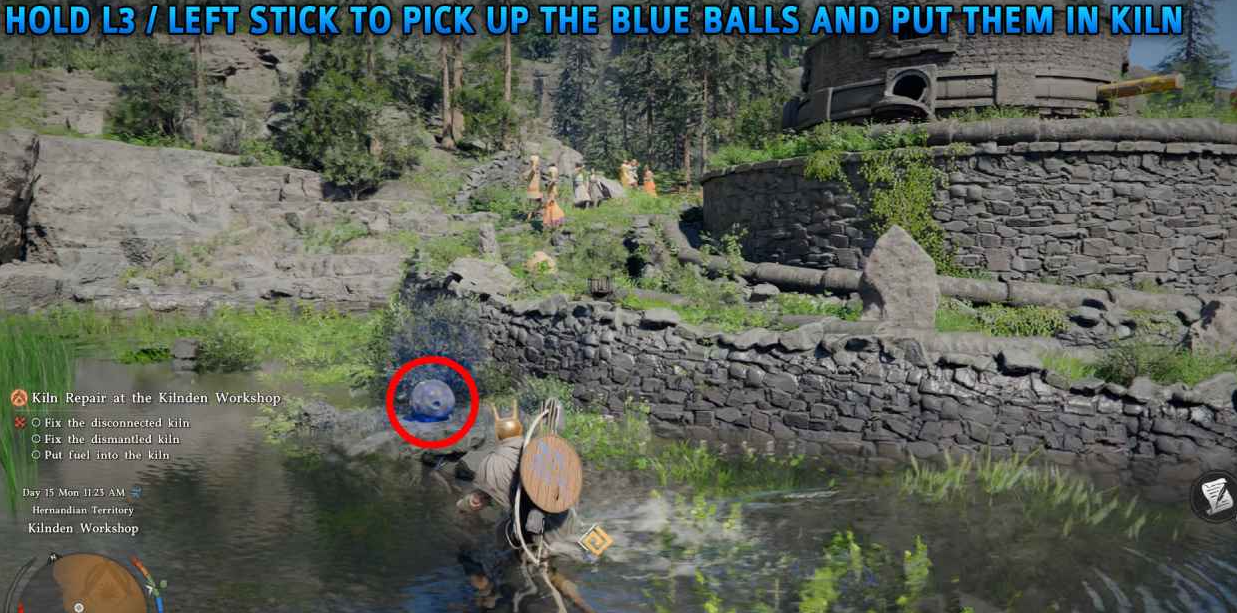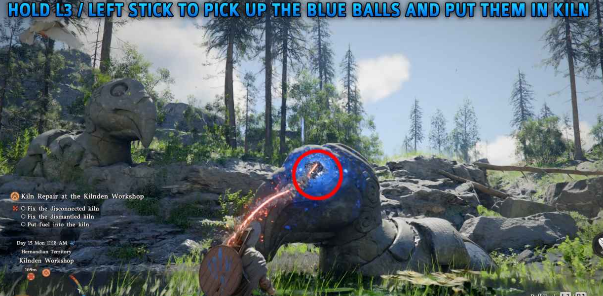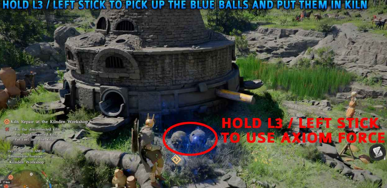 使用公理力(按住 L3)抓住蓝色球体,将其推入窑炉周围的圆形开口。所有 5 个球体都放入后,推动窑炉侧面的木制杠杆启动。