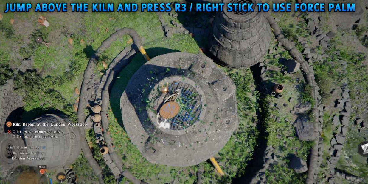 爬到堆叠的两块部件顶部,跳跃(按方块键/X 键),在空中使用原力掌(按 R3/右摇杆)。原力掌攻击会将两块部件连接在一起,窑炉看起来就修复完成了。