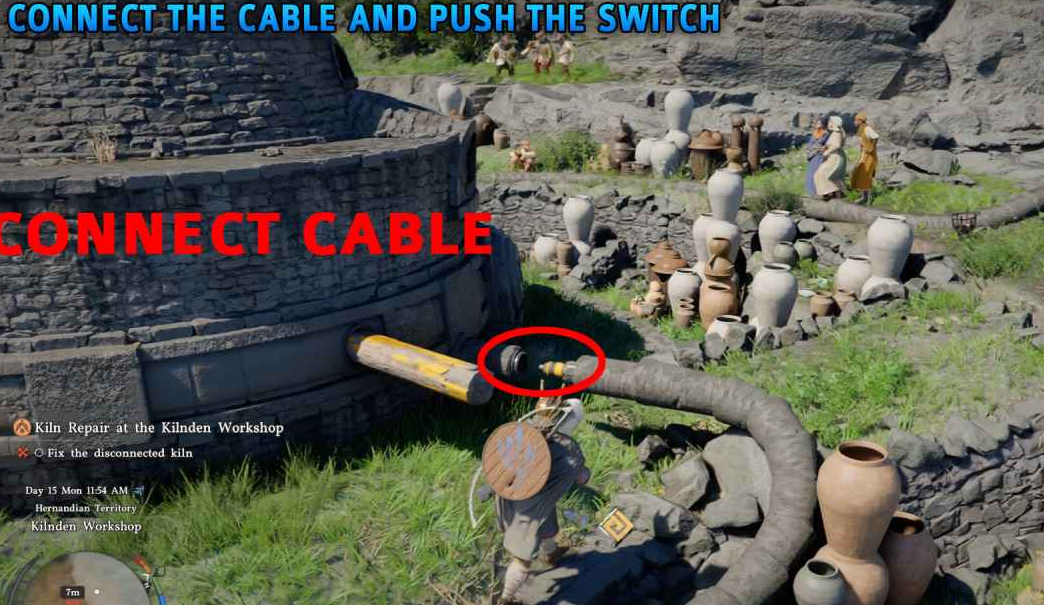 走到窑炉后面,靠近木制杠杆的位置,有一条电源线。直接与连接处松脱的电缆互动,角色会自动将电缆推回窑炉重新连接,推动木制杠杆启动窑炉。