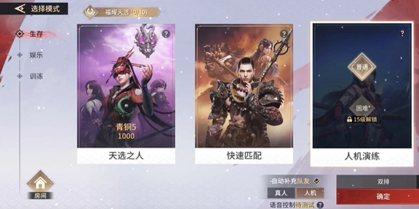 2、之后在生存中点击人机演练,选择双排,点击自动补充人机队友。