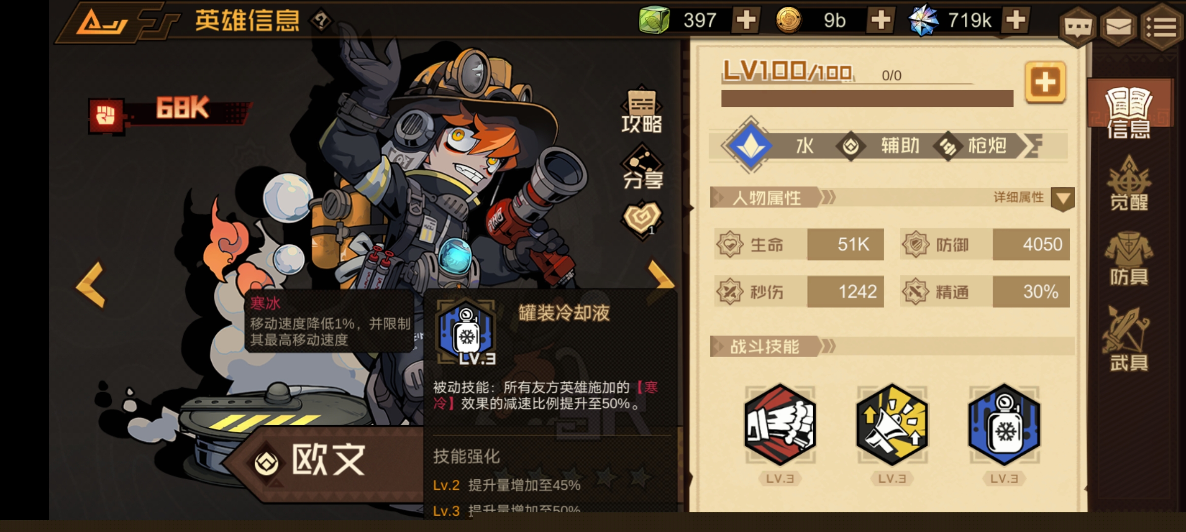 技能介绍:主动施放:欧文端起水枪朝前方喷射水柱,对被水柱命中的敌人每0.5秒造成72%秒伤的伤害并将其击退,水柱持续5秒。
