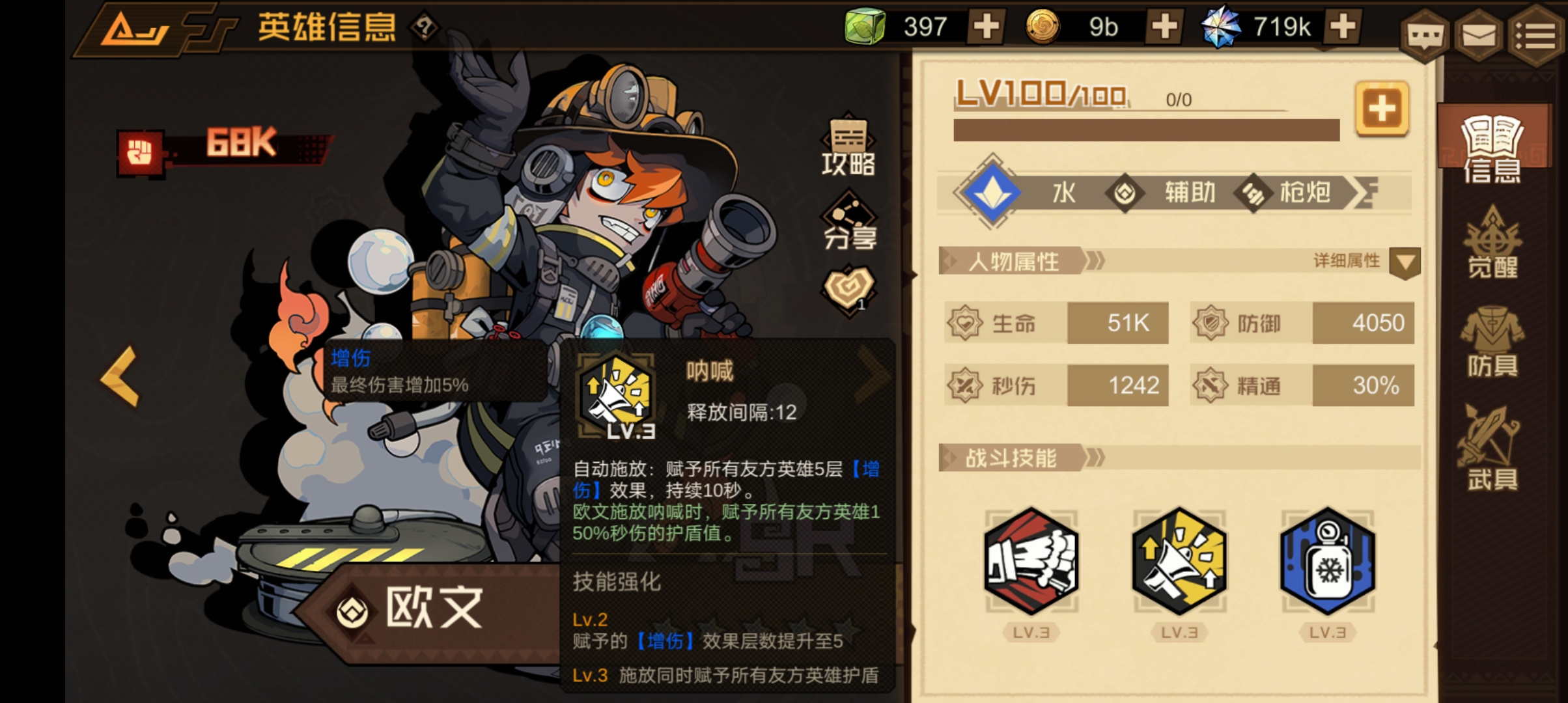 技能强化:Lv.2同时对被命中的敌人施加【破甲】效果;Lv.3单次伤害提升至72%秒伤