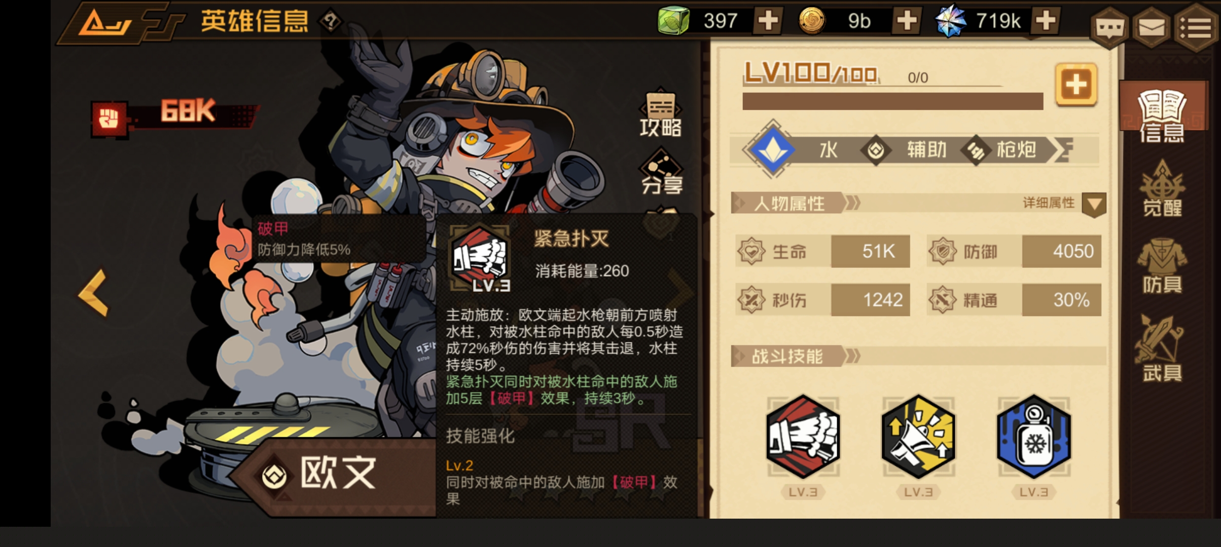 紧急扑灭同时对被水柱命中的敌人施加5层【破甲】效果,持续3秒。